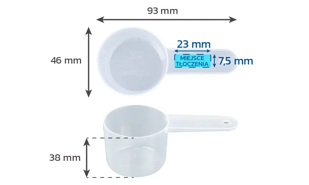 Dzięki naszym technikom znakowania możliwe jest naniesienie na wkładce tłoczonego logo na plastikowej rączce miarki lub informacji klienta. Oferujemy personalizację w granicach pokazanego miejsca wkładki na tłoczenie, co pozwala na wyróżnienie Twojej marki i dostosowanie produktu do Twoich potrzeb.
